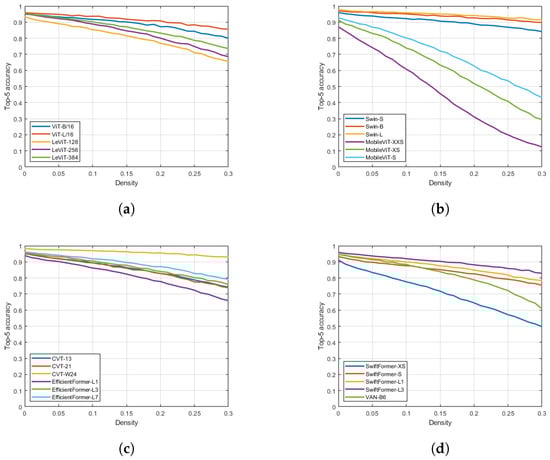 Top-5 accuracy rates under different salt-and-pepper distortions. (a) SwiftFormer-XS, SwiftFormer-S, SwiftFormer-L1, SwiftFormer-L3, VAN-B6. (b) CVT-13, CVT-21, CVT-W24, EfficientFormer-L1, EfficientFormer-L3, EfficientFormer-L7. (c) Swin-S, Swin-B, Swin-L, MobileViT-XXS, MobileViT-XS, MobileViT-S. (d) ViT-B/16, ViT-L/16, LeViT-128, LeViT-256, LeViT-384.