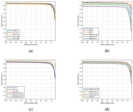 Top-5 accuracy rates under different JPEG distortions. (a) SwiftFormer-XS, SwiftFormer-S, SwiftFormer-L1, SwiftFormer-L3, VAN-B6. (b) CVT-13, CVT-21, CVT-W24, EfficientFormer-L1, EfficientFormer-L3, EfficientFormer-L7. (c) Swin-S, Swin-B, Swin-L, MobileViT-XXS, MobileViT-XS, MobileViT-S. (d) ViT-B/16, ViT-L/16, LeViT-128, LeViT-256, LeViT-384.