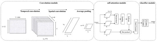 - Convolution module: The EEG signals after preprocessing and augmenting are learned through two 1D temporal and spatial convolution layers. The first temporal convolution layer learns the time dimension of input, and then the spatial convolution layer learns the spatial features. The spatial features are the information between the electrode channels. Then, the feature maps go through batch normalisation to avoid overfitting and the nonlinearity activation function ELU. The average pooling layer smooths the feature maps and rearranges to put all feature channels of each temporal point as a token into the self-attention module.