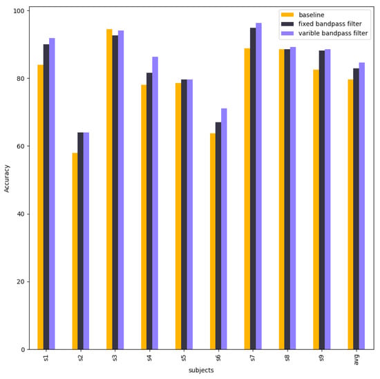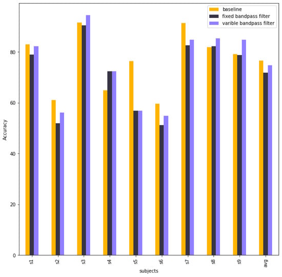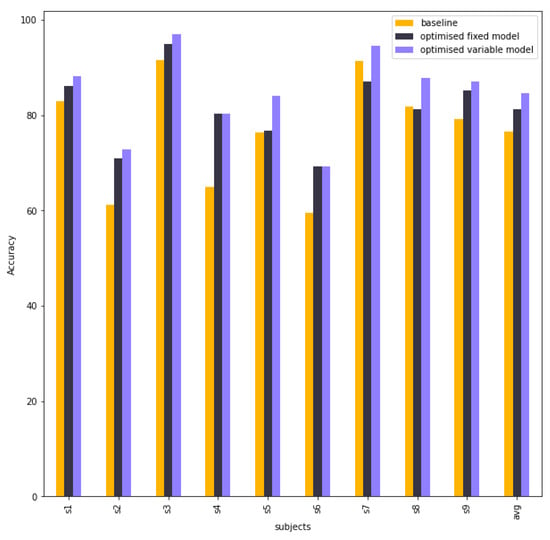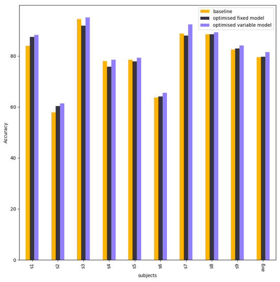 Table 5 compares the accuracies between the baseline model, fixed model, and variable model. The fixed model is better than the baseline model in subject 2, subject 4, subject 6, and subject 9, whereas others are nearly equal. When each subject is selected as the best result in the variable model, the final performance is much higher than the baseline model, especially for subject 2, subject 4, subject 5, subject 6, and subject 9.