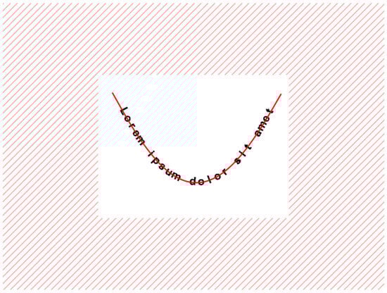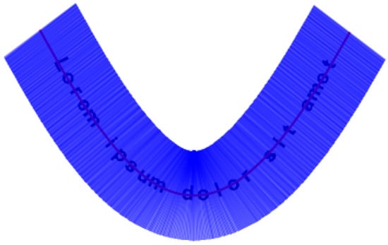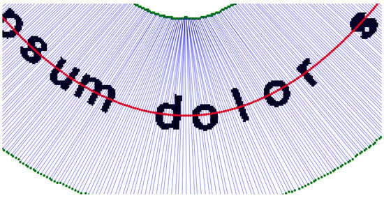 The proposed methodology for the analysis and alignment of geometric curves is structured into four primary steps, each crucial for the accurate determination and alignment of curvature. The first step is the estimation of the initial curvature of the geometric shapes. Generalized additive models are employed to capture the non-linear relationships within the data, providing a smooth and flexible estimation of the curve’s initial curvature. The second step involves the extraction of assistive control points. These points are situated across the direction of the normal at each of the curve’s sample points, strategically placed for maintaining the integrity of the curve’s structure properties during further manipulations. During the third step, Bresenham line algorithm [18] is applied to all relevant control point pairs. This algorithm efficiently draws straight line segments between the extracted control points, scanning all image pixels to counteract the curvature and ensure minimal distortion of the captured content. In the final step, a refined estimation of the curvature is performed, ensuring that the estimated curvature is as close to the true curvature of the geometric shape as possible. We will demonstrate this process using an example where the text “Lorem ipsum dolor sit amet” is curved following the function, as seen in Figure 2. The following sections include figures illustrating each stage of processing.