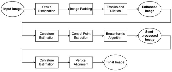 For the final step, we repeat the process up to the point of fitting the GAM curve. In this iteration, the number of splines used in the GAM is different, but once again, it is selected by the user. This flexibility allows for adjusting the model to better fit the characteristics of the semi-processed text image. Assuming that the semi-processed text image is now nearly aligned due to the preliminary processing steps, we can proceed with fine-tuning the alignment. This is achieved by manipulating the pixel columns based on the second curve estimation obtained from the updated GAM. Specifically, the pixel columns are rolled up or down according to the deviations identified in the second curve estimation. This adjustment corrects any remaining misalignments in the text, ensuring that it conforms more closely to the desired curvature. By leveraging the refined curve, we align the text with greater precision, resulting in a final image that accurately represents the intended curved text layout. It is important to note that this final step can be effectively utilized independently for scanned images of text lines where the curvature of the text is relatively mild. In such cases, the initial complex preprocessing steps may not be necessary. Instead, directly applying the final alignment process can suffice to achieve the desired text alignment. Figure 7 presents the final image, fully processed and nearly perfectly aligned. The number of splines used in this final alignment is 9. Figure 8 presents a detailed schematic diagram showcasing the workflow of the proposed method.
