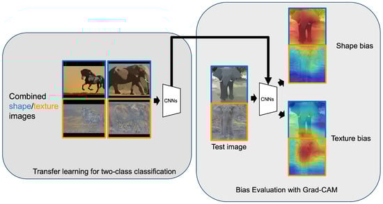 The combined shape/texture images used to calculate the bias metric (on the left side) included a shape-dominant image in the upper part and a texture-dominant image in the lower part. This combined image is used for transfer learning in a two-class classification. Subsequently, these test-combined images are input into the model, and the shape/texture bias is calculated through gradient-weighted class activation mapping (Grad-CAM).
