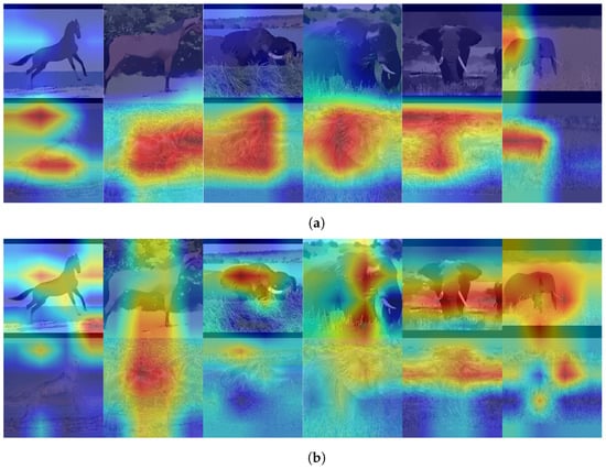 Results of Grad-CAM visualization used with the proposed shape/texture bias metric. In the case of the original ResNeXt (a texture-biased model), the heat map of the lower image (which is texture-dominant) turns red, indicating that the model is focusing on it. On the other hand, for the ResNeXt with a dilation rate of three (a shape-biased model), the heat map of the upper image (which is shape-dominant) turns red, indicating its focus. This demonstrates that simply increasing the dilation rate results in a stronger bias towards shapes in the model. (a) The visualization images were obtained by applying Grad-CAM to the original ResNeXt (texture-biased model). (b) The visualization images were obtained by applying Grad-CAM to ResNeXt with a dilation of three (shape-biased model).