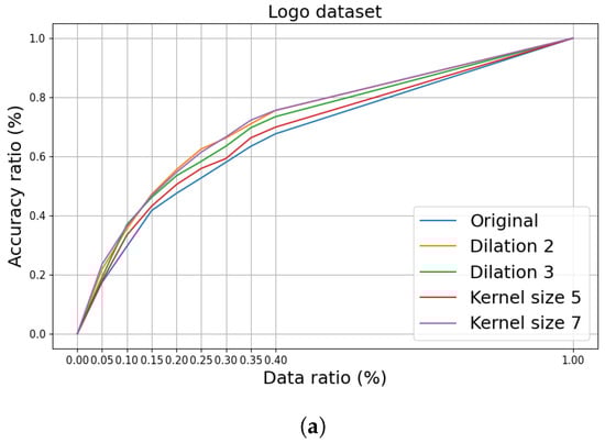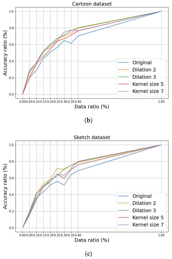 Results of limiting the training data for each dataset. The accuracy rate is defined as the accuracy achieved with limited training data divided by the accuracy achieved with the entire dataset. The data ratio represents the proportion of the data used for training. (a) Results of reducing the amount of training data in the Logo dataset. (b) Results of reducing the amount of training data in the Cartoon dataset. (c) Results of reducing the amount of training data in the Sketch dataset.