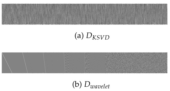 The entries of are i.i.d. Bernoulli random variables (where with equal probability) and Gaussian random numbers (where ). D and A have equal ranks. Experiments were performed on sparsifying dictionaries of , including and , which were derived using the K-SVD algorithm, based on the set of training vectors obtained from the gray-scale test image “Boat” (parameters of the K-SVD process were set at , , , , and ). The image was divided into overlapping patches of pixels with stride 2 (in each dimension) and overlaps of 4 pixels (in each dimension), which resulted in 3721 training patches. As the stride is 2 in each dimension, each patch formed a vector of 128 pixels. After the mean of each patch was normalized to zero, the resulting patches were transformed into vectors (via the vec operation) to form the set of training vectors. The dictionary was derived from the CDF 9-7 wavelet. The first 640 columns (i.e., each level has 128 columns and there are 5 levels) in were obtained from the first 5 levels (the support of a wavelet at level 6 is larger than the size of an image patch), whereas the remainder were generated randomly. The column norms of the sparsifying dictionaries were normalized. Figure 1 and Figure 2 present the sparsifying dictionaries and corresponding matrices G, derived for various A in accordance with (4). The subgraph associated with G in Figure 2 corresponds to the sensing matrix of D. It is worth noting that the lack of structure in G does not contradict some research in compressed sensing literature that focuses on designing structured sensing matrices. The structured sensing matrix approach aims to efficiently manage an extensive system’s computational resources, such as storage and computational efficiency. In contrast, our research prioritizes creating a sensing matrix that complements a given dictionary, with fewer rows than columns, to maintain the RIP. Exploring the possibility of constructing a structured sensing matrix while retaining the RIP for a given dictionary is an interesting question for future investigation.