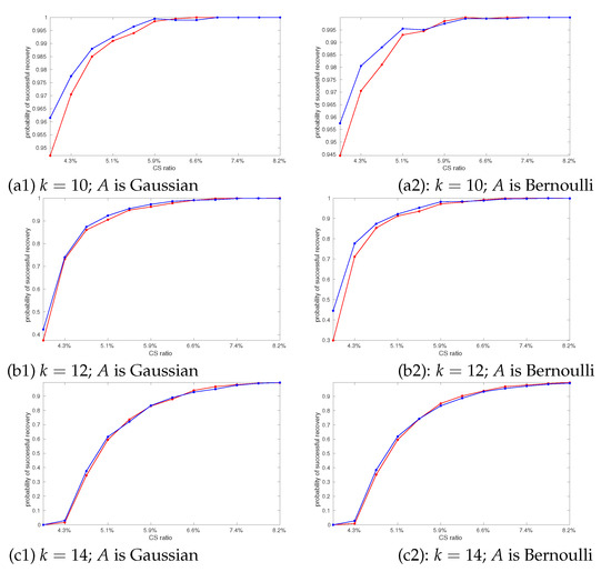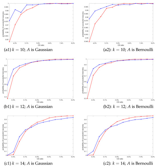 Comparisons of CS recovery performance (i.e., the probability of sparse vector recovery versus CS ratio) using sparsifying dictionary . Red and blue curves were, respectively, obtained using the benchmark (12) and our approach (11). Sparse vectors x were randomly generated and each point on the curve is the average of 2000 probability measurements. The positions of non-zero coefficients of x are uniformly distributed and the values of the non-zero coefficients of x are uniformly distributed in . In (a1,a2), sparsity level is 10; in (b1,b2), sparsity level is 12; and in (c1,c2), sparsity level is 14.