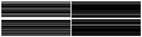 Under-sampling masks (restrained by the instrumental conditions) for 4-fold and 8-fold acceleration were applied to full k-space data according to (5). The masks sample 25%, respectively 12.5%, of horizontal scan lines including a fully sampled center region—corresponding to low spatial frequencies—containing 8%, respectively 4%, of scan lines, as shown in Figure 5. We selected CDF 9/7 wavelets with three levels as the sparsifying dictionaries. The lowpass wavelet band and the central areas of the acceleration masks may not be perfectly aligned, leading to potential artifacts in the reconstruction as a result of cross-band interference between the lowpass and highpass wavelet bands.