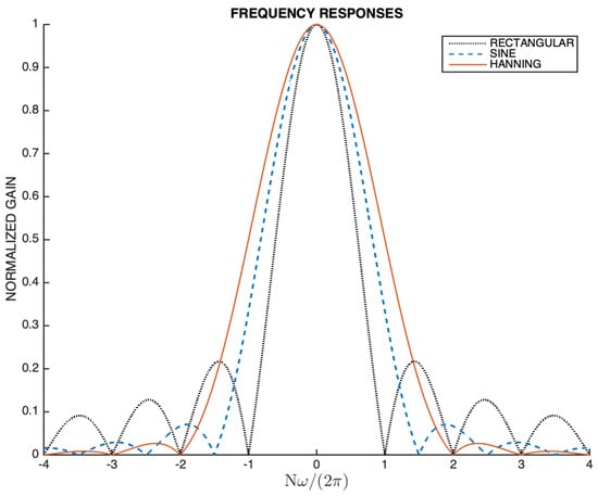 Figure 3 represents the magnitude of the frequency response of the rectangular window, i.e., , in the range , and after the gain is normalized such that the maximum gain is the unity. Two other frequency responses are also represented in Figure 3, which will be discussed in subsequent subsections. The frequency axis in Figure 3 is normalized by such that integer numbers in this normalized axis can be read as bin indices in a DFT filter bank interpretation.