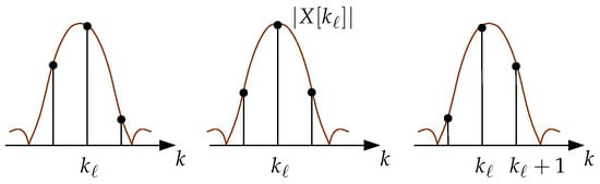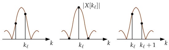 As apparent in Figure 3, the width of the main lobe of the frequency response is in the case of the sine window, and in the case of the shifted Hanning window [,]. This implies that, depending on the value of , at most three spectral lines with non-zero magnitude fall within the main lobe width of the sine window frequency response. In the case of the shifted Hanning window, the number of spectral lines is four. As in the previous subsection, if , then the spectral line corresponds to a local maximum in the magnitude spectrum when the sine window or the shifted Hanning window is used. Figure 6 illustrates the case corresponding to the sine window.