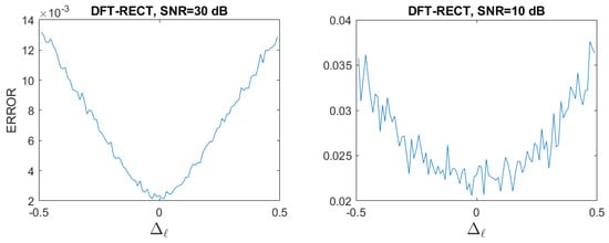 It can be seen that the estimation error distribution is consistent with the relative magnitudes of adjacent spectral bins as illustrated in Figure 4. In fact, when approaches , or , the cumulative error increases relative to the case when , which is a consequence of the fact that the magnitudes of two adjacent spectral lines become comparable and significantly lower than the maximum value they can reach (when ), which not only exacerbates leakage effects but also increases vulnerability to the noise influence. Due to the specific frequency response of the rectangular window, as Figure 3 and Figure 4 highlight, then, when and the SNR is infinity, the spectral leakage is zero, and the phase is estimated without error. The Matlab code generating Figure 5 is available (estimatePHASE_DFT_rect.m), which facilitates experimentation with other values of N, ℓ, or SNR.