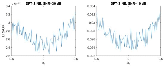 Cumulative phase estimation error as a function of the fractional frequency , when the DFT and the sine window are used. In the illustrated cases, , , SNR = 30 dB (left) and SNR = 10 dB (right).