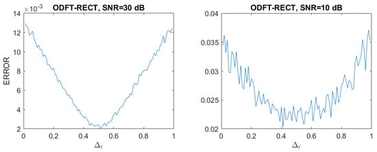 Cumulative phase estimation error as a function of the fractional frequency , when the ODFT and the rectangular window are used. In the illustrated cases, , , SNR = 30 dB (left) and SNR = 10 dB (right).