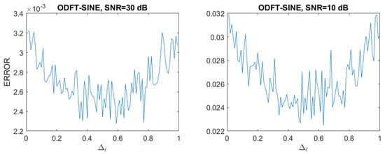 Cumulative phase estimation error as a function of the fractional frequency , when the ODFT and the sine window are used. In the illustrated cases, , , SNR = 30 dB (left) and SNR = 10 dB (right).