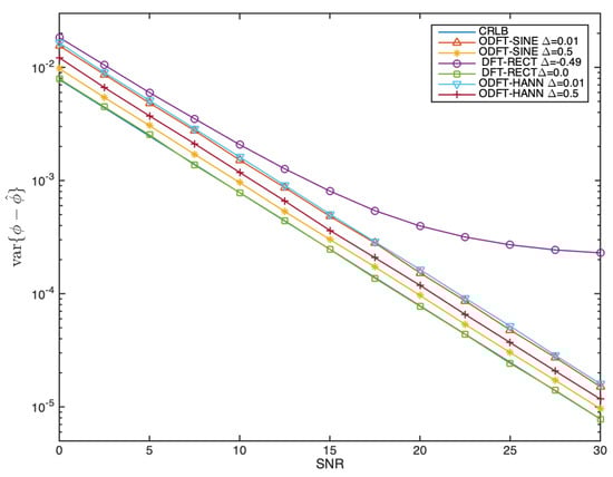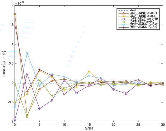 When compared to the results in Figure 5, it can be concluded that phase estimation appears to be more accurate when the sine window is used, especially when the SNR is high, which is a natural consequence of the smaller leakage caused by this window. Results are similar if the shifted Hanning window is considered instead. As we shall see in Section 2.5, more informative conclusions will emerge from a study of the phase estimation error variance.