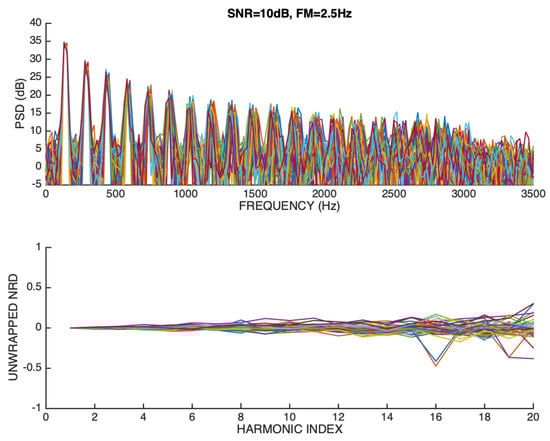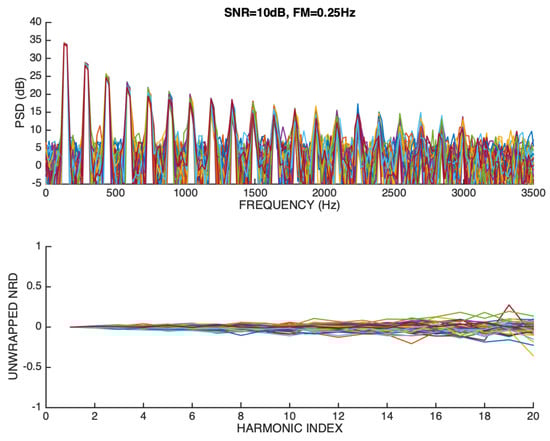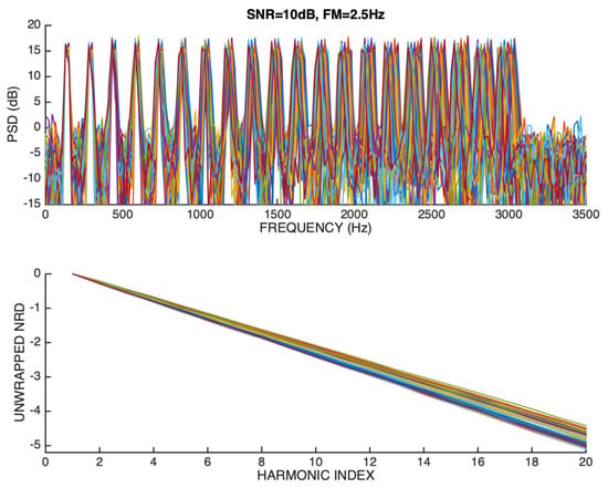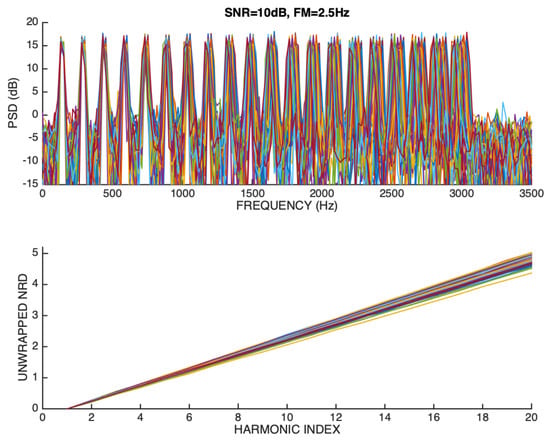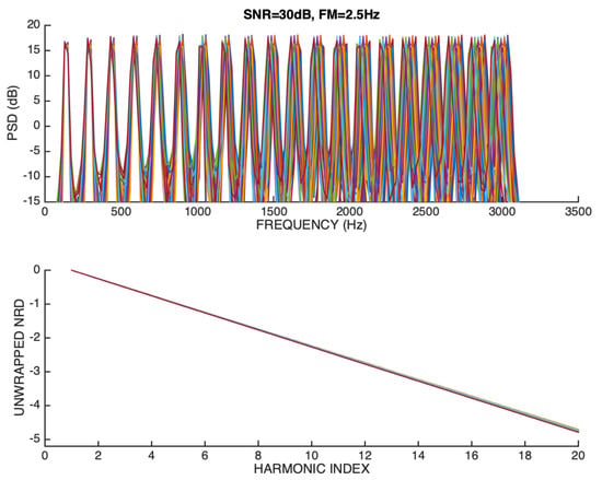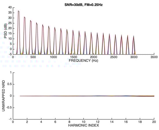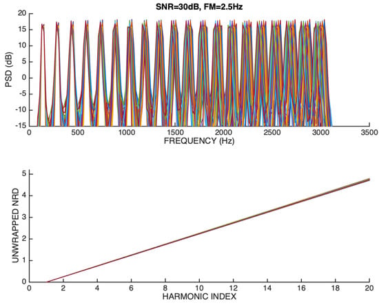 It can be confirmed that the unwrapped NRD vectors match quite precisely the ground-truth NRD model according to (36). This model is a simple first-order equation whose value is when . This good match happens despite the fact that FM modulation is substantial, especially for higher-order harmonics. As noted in the previous subsection, this is a consequence of the fact that NRD is intrinsically independent of the fundamental frequency.