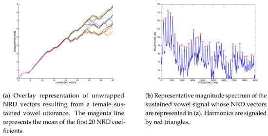 It can be seen that the NRD vectors are quite consistent up to harmonics 43–44, which are located around 5 kHz. Figure 25b depicts one representative magnitude spectrum of the vowel signal and it can be confirmed that, similarly to the previous case, the magnitudes of higher-order harmonics approach the noise floor, which makes phase estimation essentially unreliable.