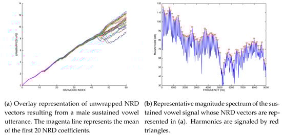 It can be seen that NRD vectors are very consistent up to harmonic 22, beyond which, dispersion in the NRD vectors is apparent. This reflects the fact that phase estimation is disturbed after harmonic 22, which can be easily understood by observing one representative magnitude spectrum of the signal, as represented in Figure 24b. In fact, it can be confirmed that harmonics 22 and 23, at around 5 kHz, have a very small magnitude, which makes them particularly vulnerable to the noise influence, and leakage effects, which obviously adversely affect phase estimation. In any case, the most important harmonics are correctly characterized in their phase structure, which means reliable NRD models can be built that can be used in parametric-oriented speech processing, as illustrated in Figure 2. Our recent research, which assumes this framework, has revealed that when simple NRD modeling is used in the synthesis process, signal reconstruction with transparent audio quality can be achieved, even if the NRD region that exhibits dispersion is replaced by a simple line resulting from extrapolation based on the reliable NRD region (i.e., for which the unwrapped NRD coefficients are consistent) [].
