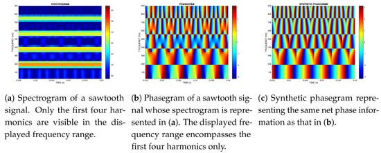 Spectrogram (a), phasegram (b), and synthetic phasegram (c) characterizing the first 4 harmonics of a sawtooth waveform.