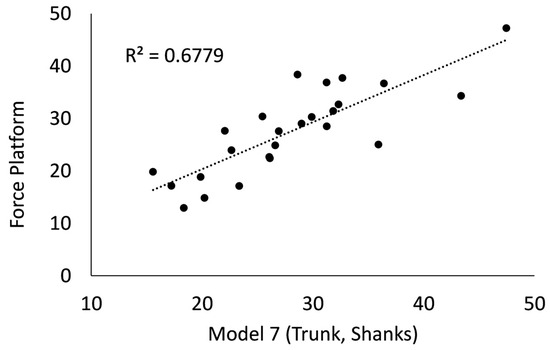 The IMU models with the lowest RMSE also exhibited the smallest systematic bias for CMJ JH. For instance, the systematic bias for the best-performing 2- and 3-segment models was −0.1 cm and 0.3 cm, respectively, while the bias for the 4-segment and best-performing 1-segment models was 1.5 cm and 2.5 cm, respectively. However, it is important to note that no statistically significant differences were observed between any of the models when compared to the force platform criterion. Although the relatively small systematic bias observed in this investigation is consistent with biases reported in recent research using the flight time method [20,21,22,33], systematic bias alone does not fully reflect validity. For example, the 2-segment model, including the trunk and shanks, yielded the lowest systematic bias (−0.1 cm). However, when simple linear regression was performed, the coefficient of determination (R² = 0.68, Figure 1) indicated that the IMU model contains random error not fully explained by the systematic bias.