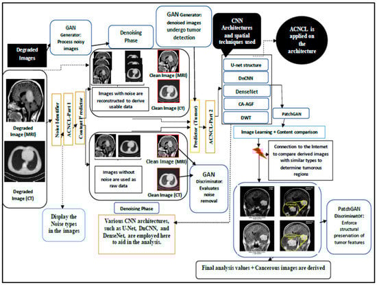 The ACNCL denoising and tumor detection model leverages Generative Adversarial Networks (GANs) to separate content and noise in medical images, enhancing denoising and tumor detection. GANs are increasingly preferred over traditional CT and MRI scan methods due to their ability to model complex noise distributions. Unlike conventional techniques, GANs learn to differentiate noise from essential structures, preserving critical details like tumor boundaries. This results in sharper images optimized for tumor detection.