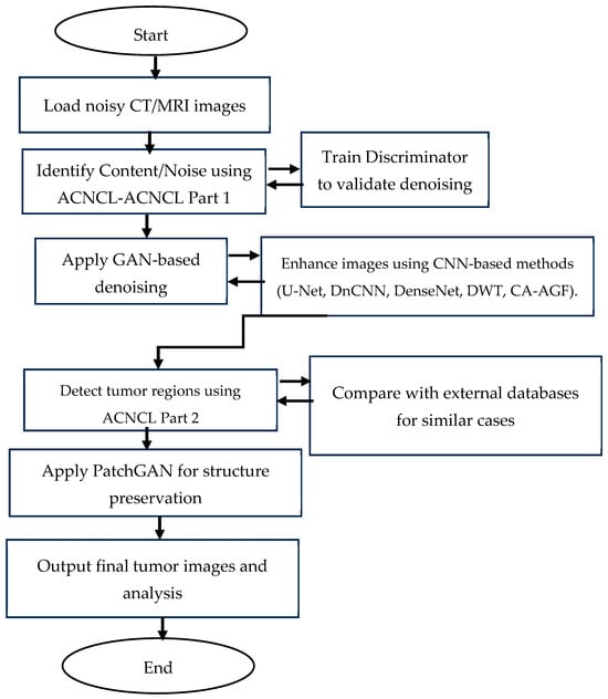 The flowchart in Figure 2 illustrates a structured approach to denoising and tumor detection in MRI and CT images using a Generative Adversarial Network (GAN)-based model integrated with Content and Noise Complementary Learning (CNCL). It starts with loading noisy MRI/CT images, followed by identifying noise types using ACNCL-Part 1, which classifies noise for appropriate processing. The GAN Generator then removes noise while reconstructing useful image data, and the GAN Discriminator evaluates the effectiveness of this denoising process. The denoised images are further enhanced using CNN-based methods, including U-Net, DnCNN, DenseNet, DWT, and CA-AGF, to improve structural clarity. The ACNCL-Part 2 predictor detects potential tumor regions in the processed images, after which PatchGAN ensures the structural preservation of tumor features. The refined images are compared with external medical databases to confirm tumor regions, and the final output presents tumor-marked images with diagnostic insights for medical evaluation.