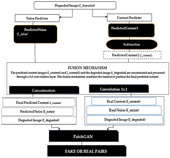- Loss Function: To define the loss function, we followed the approach suggested by [31], using a combination of PatchGAN loss and L1 loss. This composite loss function, denoted as , is formulated as follows:where represents the GAN loss (based on PatchGAN), is the L1 loss, and is a weighting coefficient for the L1 component.The GAN loss is expressed aswhere denotes expectation, is the Generator, is the Discriminator, represents the degraded image and yields the estimated noise and content components and . In this model, the Discriminator seeks to maximize this objective, while the Generator attempts to minimize it.The L1 loss, , is separated into two distinct parts:Here, LL1-content quantifies the mean absolute error between the generated content and the actual content , while measures the mean absolute error between the predicted noise and the true noise . The parameter serves as a scaling factor for .