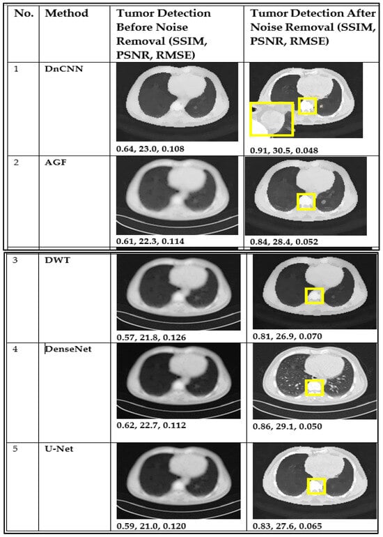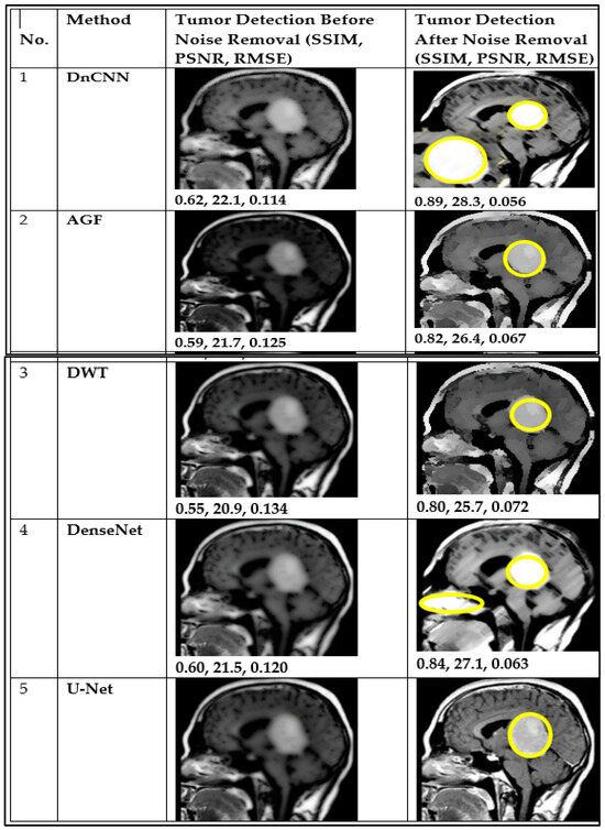 Figure 8 and Figure 9 illustrate the results of CT and MRI image denoising for tumor detection (BDn) and (ADn). The performance in both CT and MRI images indicates improved visual representation after denoising, enhancing the detection of tumors in low-quality images. The DnCNN outperformed other methods based on PSNR (29.5 dB) and SSIM (0.91) for CT images and a PSNR of 28.3 dB and SSIM of 0.89 for MRI images, as shown in Figure 8 and Figure 9 and confirmed in Table 2 and Table 3. The good performance of DnCNN is attributed to its ability to learn from a large dataset of noisy and clean image pairs, enabling it to better preserve important image features while removing noise. It was closely followed by DenseNet and contrasted with the poor output of AGF. Generally, the impact of CT images in Figure 8 was higher than the MRI images in Figure 9. This is attributed to MRI scans having more complex noise characteristics, such as spatially varying noise, which makes it harder for the model to generalize. Table 2 and Table 3 below confirm the results of Figure 8 and Figure 9, with DnCNN outperforming the rest in terms of PSNR, SSIM, and RMSE.
