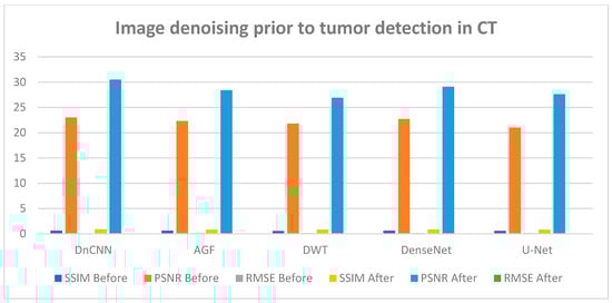 CT image performance in tumor detection BDn and ADn using DnCNN, AGF, U-Net, DWT, and DenseNet.