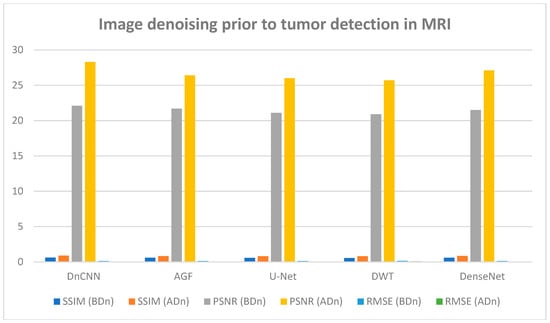 MRI image performance in tumor detection BDn and ADn using DnCNN, AGF, U-Net, DWT, and DenseNet.