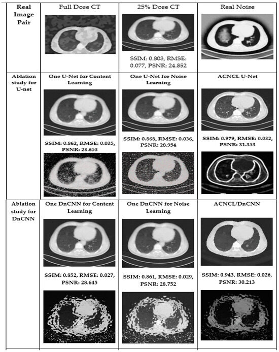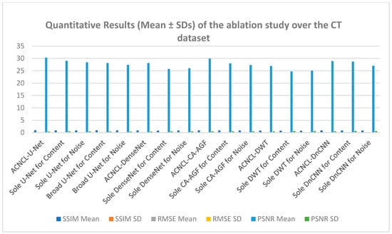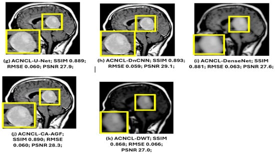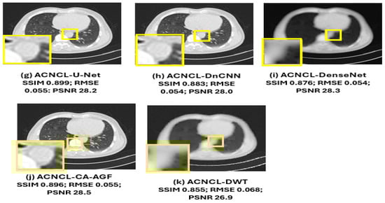 The findings in Figure 15 below reveal that ACNCL-based models outperformed their reference models due to the incorporation of Adversarial Content–Noise Complementary Learning. The ACNCL-DnCNN achieved a higher SSIM value of 0.893, indicating better preservation of structural similarity between the denoised image and the ground truth, as well as a lower RMSE of 0.059, suggesting reduced error in the denoised image. Additionally, it showed a higher PSNR value of 28.1 dB, reflecting better overall image quality compared to the reference DnCNN model, which had an SSIM of 0.829, RMSE of 0.071, and PSNR of 26.6 dB. These improvements suggest that ACNCL enhances the model’s ability to handle noise while maintaining key image features more effectively.