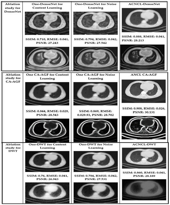 To gauge the performance of the Adversarial Content–Noise Complementary Learning (ACNCL) denoising model for image denoising and tumor detection, we conducted a comprehensive ablation study on a CT image dataset of lung adenocarcinoma from The Cancer Genome Atlas (TCGA-LUAD) sourced from Kaggle. As shown in Table 4, the analysis compared ACNCL-enhanced networks with baseline models that employed a sole predictor, assessing improvements under different configurations. Specifically, ACNCL-U-Net was compared with the sole U-Net predictor that only focused on content learning and the sole U-Net predictor that only focused on noise learning. The comparative results revealed that ACNCL-U-Net outperformed both baseline models, showcasing its ability to effectively balance content and noise learning for enhanced diagnostics. A broad U-Net with enhanced convolutional layers for content learning and a broad U-Net with enhanced convolutional layers for noise learning were also compared. The findings indicated that the ACNCL-U-Net maintained its outstanding performance, demonstrating a robust architecture that leverages both content and noise features more effectively than the broader U-Net variants. Comparatively, ACNCL-DenseNet was compared with the sole DenseNet predictor focused on content learning and the sole DenseNet predictor focused on noise learning. Additionally, ACNCL-CA-AGF was compared with the sole CA-AGF predictor focused on content learning and the sole CA-AGF predictor focused on noise learning. Separately, the ACNCL-DWT was compared with a sole DWT predictor focused exclusively on content learning and one DWT predictor focused on noise learning. The training followed the same GAN model outlined in Figure 3, except that the generator was adjusted for each network.