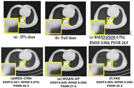 Medical imaging is crucial for accurate diagnosis, utilizing CT, MRI, PET, X-ray, and ultrasound to reveal internal structures [1,2]. However, the noise inherent in these imaging techniques, such as Gaussian noise in CT and MRI, compromises image quality and challenges accurate diagnosis, particularly in detecting small lesions and tumors [3]. Traditional noise reduction methods like non-local means, wavelet transforms, and spatial filters often over-smooth images, obscuring critical details needed for tumor delineation and compromising diagnostic accuracy [4,5,6]. Recent advancements in deep learning have shown promise in medical image denoising [7]. Techniques like fractal networks (FNs) [8], variational autoencoders (VAEs) [9], and Generative Adversarial Networks (GANs) [10] have improved the visual quality of CT and MRI scans. Methods such as U-Net [11] architectures and convolutional neural networks (CNNs) [12] have effectively reduced noise and recovered degraded images. In another study [13], a denoising convolutional neural network (DnCNN) was utilized to recover MRI images degraded by Rician noise. In their work [14], they developed a sparse convolutional neural network (SCNN) along with a deep learning-based reconstruction model (DLRM) to denoise brain MR images and detect lesions. A convolutional autoencoder–decoder with residual learning (RED-CNN) [15] was successfully employed to estimate a normal-dose CT image from its low-dose counterpart. DenseNet [16] and block-matching 3D (BM3D) [17] have been used for Content–Noise Complementary Learning. While DenseNet faces high memory usage, limiting real-time noise removal, BM3D excels with Gaussian noise but struggles with structured noise and large images. A conditional GAN with a VGG (Visual Geometry Group) (CGAN-VGG) showed perceptual loss in the ability to preserve perceptual quality and fine details; that said, instability in training when balancing the adversarial and perceptual losses is challenging and often leads to overfitting [18]. The Wasserstein GAN was used in [19,20] for low-dose denoising, and the performance indicated improved training instability by reducing sudden discriminator dominance.