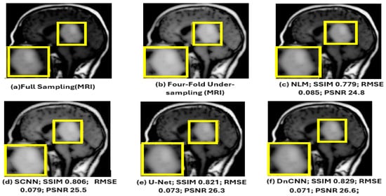 As shown in Figure 14 below, the yellow parts indicated tumorous regions identified. All deep learning methods displayed better results, but NLM, while effective at low-to-moderate noise levels, struggled with higher noise levels, leading to over-smoothing of the images. This resulted in the loss of important structural details, especially in areas with subtle contrasts, which is critical for accurate diagnosis. Although the SCNN performed reasonably well, it introduced some noise, which could compromise the diagnostic quality of the images. Both U-Net and DnCNN were effective in noise reduction but at the cost of losing some textural information, which is crucial for accurate diagnosis. The ACNCL-CA-AGF displayed better performance compared to ACNCL-DnCNN and ACNCL-U-NET in image restoration and tumor detection. In general, the proposed ACNCL-based networks were superior to the comparison methods both in noise removal and structural restoration. The quantitative results of the complete cross-validation are provided in Table 6. Compared with the reference methods, the ACNCL-based networks had better performance in terms of all evaluation metrics.