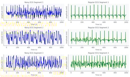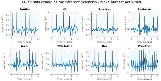 The study collected data from 17 healthy individuals, each contributing an average of 37 min of synchronized sensor recordings, with the recordings from 11 participants containing pre- and post-running walking periods. This subset yielded 563.8 min of ECG data, averaging 51.25 min per participant, allowing for an examination of ECG signal variations across different physical activities. In Figure 1, we can observe differences in the ECG signals for these different activities, demonstrating that some activities introduce more noise than others, such as jumping and lifting weights. All data were collected from healthy volunteers, none of whom had a history of cardiovascular disease, such that the noise to be analyzed was primarily caused by environmental and motion-related sources.