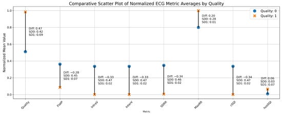 Normalized mean values of ECG features for segments categorized as “Quality 0” (unacceptable) and “Quality 1” (acceptable). Each metric is represented by a pair of points connected by a vertical line, with the blue point indicating the average for a quality of 0 and the orange point for a quality of 1. The vertical separation between points of the same metric illustrates the Diff, which represents the absolute difference between the mean values of each metric for “Quality 1” and “Quality 0”; SD0 represents the standard deviation of the metric values for “Quality 0” segments; and SD1 denotes the standard deviation for “Quality 1” segments.