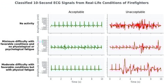 Classified 10 s ECG signals from firefighters under real-life conditions. The left column shows examples of acceptable signals, while the right column shows unacceptable signals under three different dynamic activity conditions: (1) no activity; (2) the minimum difficulty with favorable conditions and no physiological or psychological fatigue; and (3) moderate difficulty with favorable conditions but with physical fatigue.