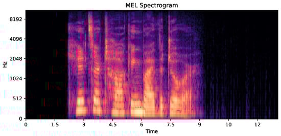 This subsection outlines the pre-processing steps to prepare RAVDESS audio data for SER models. Neural Networks yield efficient results in processing images, and CNN algorithms form the backbone of this research. While RAVDESS contains audio files, processing these audio files into images was mandatory to leverage CNN capabilities. Prior to giving the data directly to the models, the dataset is initially transformed into a form suitable for model processing. Pre-processing is a very important step because it transforms the data into a suitable format. Each audio signal is processed to create an image representation called the Mel spectrogram using mathematical transformations. To mitigate noise from multimodal data (e.g., background sounds or actor variability), audio was standardized to a 16 kHz sample rate, and silent segments were trimmed. First, the audio signal is divided into short overlapping segments using a process called windowing with a 25 ms window and 10 ms overlap. Each segment undergoes a Fourier Transform to convert it into the frequency domain, where it is represented as a spectrum of frequencies. These spectra are then transformed into a Mel scale, which approximates how humans perceive pitch. This transformation helps to emphasize perceptually relevant features in the audio. The resulting Mel spectrogram is essentially a 2D image, where time is represented on the horizontal axis and frequency on the vertical axis. Additionally, color intensities or brightness in the image correspond to the magnitude of each frequency component. Figure 2 shows a Mel spectrogram sample generated after preprocessing.