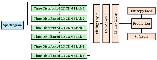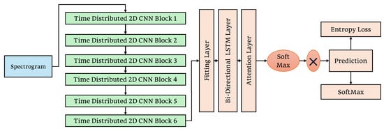 We designed the model as shown in Figure 3. This model starts with six time-distributed 2D CNN blocks that process segmented Mel spectrogram chunks, which are the spectra of the speech audio files obtained after pre-processing. The first two convolutional blocks apply a 5 × 5 kernel with a stride of 1 and padding of 2, while the remaining four use a 3 × 3 kernel with padding of 1. This configuration ensures that spatial dimensions are preserved throughout most convolutional operations. The initial convolution layers in each block extract local features from the input spectrograms. Batch normalization follows each convolution to stabilize and accelerate training, as described in Equation (4).