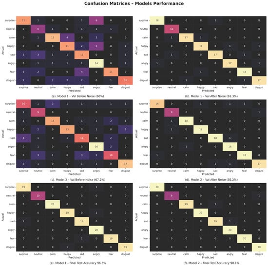 Confusion matrices are essential for evaluating classification tasks. Figure 5 provides a comprehensive comparison of both models, before and after noise augmentation, as well as their final test performance. Figure 5a,b show the validation results of Model 1 before and after adding uniform noise, respectively. Initially, Model 1 struggles to differentiate between emotionally similar classes like sad and calm, as seen in Figure 5a. After uniform noise augmentation, Figure 5b shows significant improvements across most emotions, especially in reducing misclassification of neutral, which had fewer training samples.