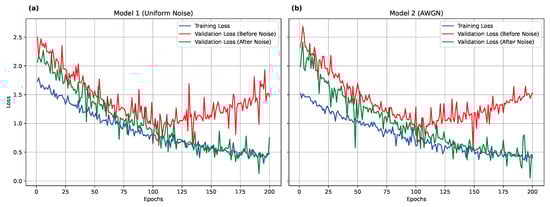 Training and validation loss curves for both models. (a) Model 1 uniform noise; (b) Model 2 AWGN.