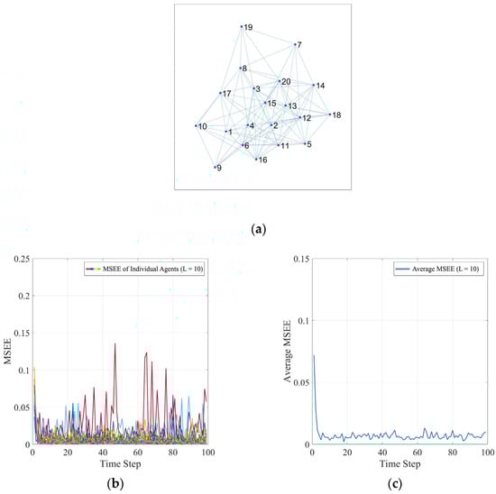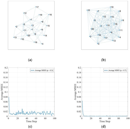 This case study investigates how the density of the communication graph affects the tracking performance. Two random graphs with twenty agents are generated: one with a connection probability of , representing a highly connected network (Figure 2b), and one with a low connectivity of (Figure 2a). The corresponding average MSEE results for these configurations are shown in Figure 2c,d.