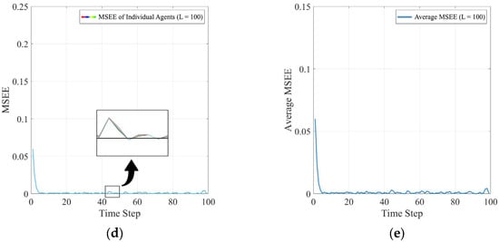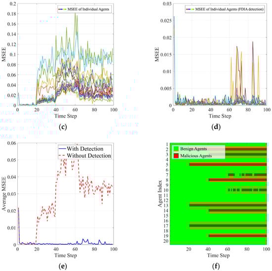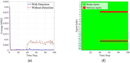 Figure 5e compares the average MSEE across all agents for both algorithms, further confirming the significant performance improvements provided by the detection mechanism under cyber–physical threats. Finally, Figure 5f illustrates the detection heat map, which correctly identifies agents 5 and 17 as under attack after .