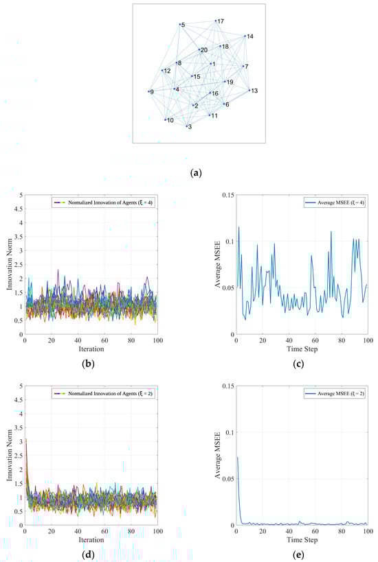Effect of saturation filter parameters on tracking performance: (a) Network graph; (b,c) Normalized innovation of individual agents and average MSEE of all agents for the soft filter (), shown in colored and blue curves, respectively; (d,e) Normalized innovation of individual agents and average MSEE of all agents for the harsh filter (), shown in colored and blue curves, respectively.