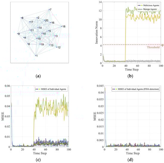 The detection process on a randomly generated network is illustrated in Figure 5a. The innovation norm for each agent is compared against the dynamic threshold explained in Equation (9), and any value exceeding this threshold is flagged as compromised, as shown in Figure 5b. Figure 5c,d present the MSEE over time for the algorithms without and with FDIA detection, respectively. The results clearly show that the proposed detection and isolation method effectively mitigates the impact of the attacks, achieving lower errors than the baseline algorithm without detection.