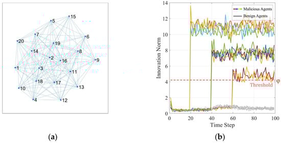 In this case study, we assume that two randomly selected agents are subjected to a high-magnitude false data injection attack after a specified time step (). The objective is to demonstrate how the detection and isolation mechanism can identify and isolate the compromised agents so that their corrupted data do not propagate through the network or degrade the overall consensus-based state estimation.