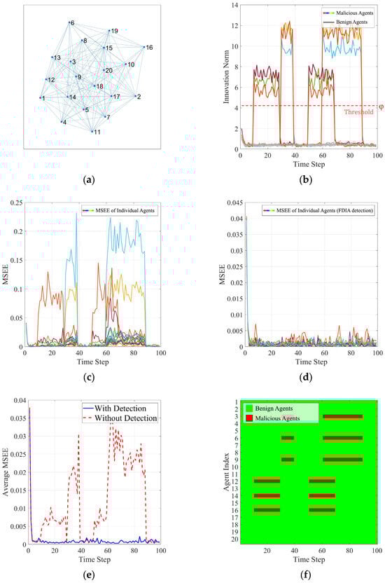 Effect of transient attacks on the proposed algorithms: (a) Random network topology; (b) Normalized innovation values for individual agents compared against the detection threshold , where spikes above the threshold (red dashed line) indicate agents under false data injection attack (colored curves), whereas values below the threshold (gray curves) correspond to benign agents; (c) mean-squared estimation error (MSEE) over time for individual agents for the baseline algorithm without FDIA detection (shown in colored curves); (d) MSEE over time for individual agents for the proposed algorithm with FDIA detection enabled (shown in colored curves); (e) Comparison of average MSEE of all agents for both algorithms, where the blue line denotes the FDIA-enabled method and the red dashed line denotes the baseline; (f) Attack detection map (“heat map”), where red regions indicate malicious agents and green regions indicate benign agents.