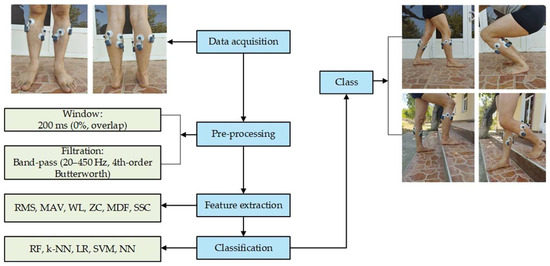 Figure 1 illustrates the sequence of the research organization process. In the first stage of the process, EMG signals are recorded in real time using two devices, and a data set is formed. In the next stage, the initial signal processing process is performed on the raw data. In this stage, the signals are cleaned of various noise and artifacts, and signal cleaning filtration operations are performed using low-pass filter, high-pass filter, band-pass filter, and notch filters. After the initial processing, a feature extraction stage is performed to identify the most important components of the signal. In the final stage, each leg movement is classified using classification algorithms (SVM, KNN, RF, NN, and LR).