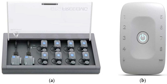 In this study, two different EMG acquisition systems—the 8-channel BTS FreeEMG 1000 (Figure 2a) (Milan, Italy, BTS Bioengineering S.P.A.) and the 8-channel Biosignalsplux (Figure 2b) (Lisbon, Portugal, PLUX Wireless Biosignals S.A.)—were purposefully selected to evaluate the consistency, generalizability, and robustness of LLL movement classification across varying hardware platforms. This choice was motivated by both their technical distinctions and their practical relevance in different application domains. The technical specifications of the two devices are listed in Table 2.