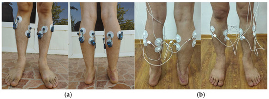 During the signal recording process, Ag/AgCl (silver chloride) electrodes were used and placed in the innervation zones of the muscles (Figure 3a,b).
